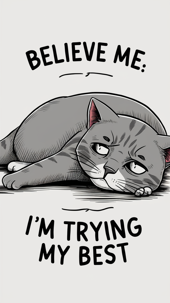 This free phone wallpaper features an HD background illustration of a gray striped cat lying down with a tired but determined expression. The minimalistic design and plain background create a calm, introspective vibe that resonates with feelings of effort and perseverance. Perfect for any phone, this dark wallpaper fits well on both iPhone and Android devices. The inspirational message above the cat encourages users to keep trying their best, making it an ideal choice for those seeking motivation on their lockscreen. Add this charming, high-quality wallpaper to your collection to stay motivated every time you unlock your phone.