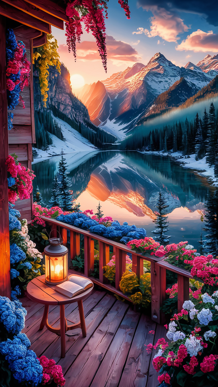 Discover this free phone wallpaper capturing a serene balcony scene overlooking a mountain lake surrounded by snow-capped peaks and evergreen trees. The vibrant flowers on the wooden railing add a burst of color against the calming natural backdrop. The warm sunset glow creates a peaceful and cozy vibe, perfect for anyone seeking a calming dark wallpaper or a nature-inspired HD background. This stunning image is compatible with most smartphones including iPhone and Android devices, making it an ideal choice for those wanting to elevate their lockscreen aesthetics with a tranquil, high-quality nature photo.