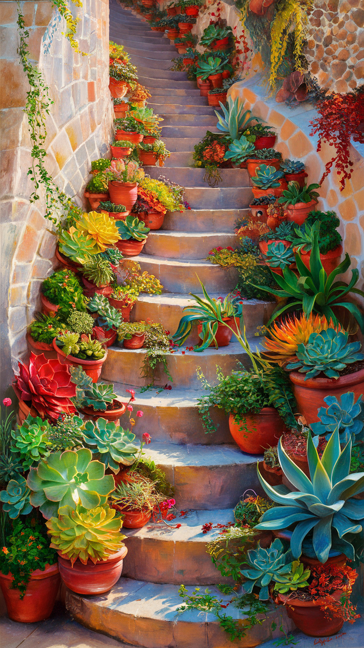 Enhance your phone with this free wallpaper showcasing a charming outdoor stone staircase adorned with vibrant succulents in terracotta pots. The curved stairs bordered by lush plants create a warm and inviting vibe, perfect for nature lovers and those who appreciate earthy aesthetics. This HD background combines deep greens, reds, and yellows that pop beautifully in natural sunlight, making it ideal as a dark wallpaper alternative. Compatible with all phone models including iPhone and Android devices, it provides a unique and lively look to your lockscreen. The rich textures and earthy tones elevate your phone’s appearance with a refreshing, organic feel.