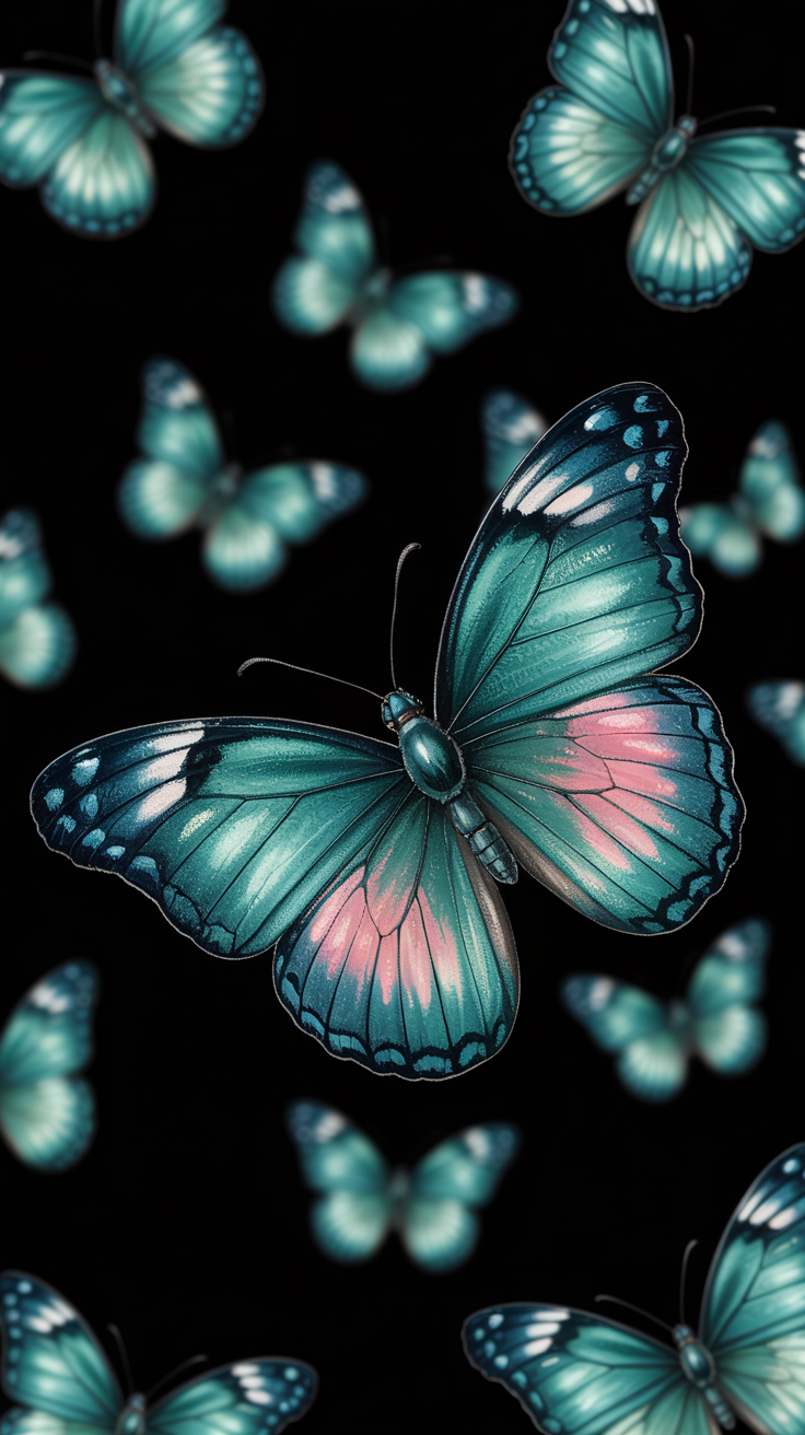 This free phone wallpaper showcases a stunning composition of vibrant teal butterflies set against a deep black background. The image highlights a large, sharp butterfly in the center, surrounded by softer, blurred butterflies, creating a beautiful sense of depth and focus. With its dark wallpaper vibe, this HD background brings a calm and elegant aesthetic to any phone screen. Perfect for iPhone and Android devices, this wallpaper offers a rich contrast that makes your home or lock screen pop. Ideal for those who enjoy nature-inspired designs with a modern twist, it’s a great option to personalize your phone with striking color tones and sharp details.