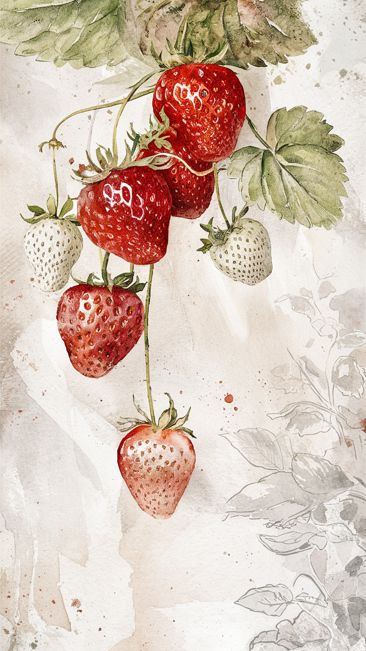 Enhance your device with this stunning free phone wallpaper featuring a watercolor-style strawberry illustration. The HD background displays strawberries at different ripeness stages from white and light pink to fully red, surrounded by detailed green leaves on a soft beige backdrop. This dark wallpaper combines artistic vibes with natural beauty, making it perfect for users who want an elegant yet fresh aesthetic. Compatible with most smartphones including iPhone and Android devices, this background ensures a unique look that stands out. Whether you prefer light or dark mode, this subtle gradient enhances visibility and style for your lock screen or home screen.