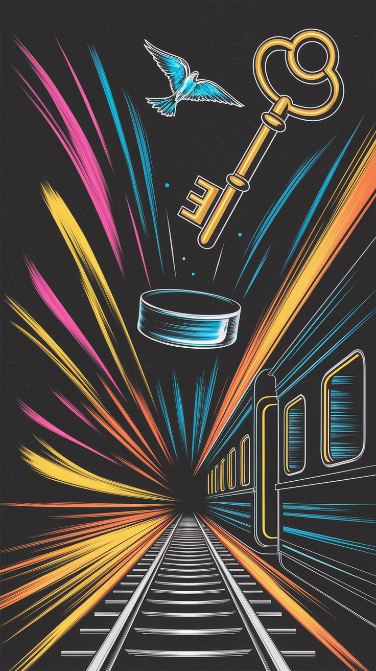 Discover this free phone wallpaper showcasing a vibrant, stylized illustration of train tracks converging into a dark vanishing point on a black background. The image features a partial train carriage outlined in blue, yellow, and white strokes, adding depth and interest. Floating above the tracks are a golden key, hockey puck, and blue bird, surrounded by bright streaks of yellow, orange, pink, and blue that create a dynamic and energetic vibe. Perfect as a dark wallpaper or HD background, this design enhances the aesthetic appeal of both iPhone and Android devices. Its surreal and lively composition makes it a unique free wallpaper choice for anyone looking to refresh their phone lockscreen with vivid colors and motion.