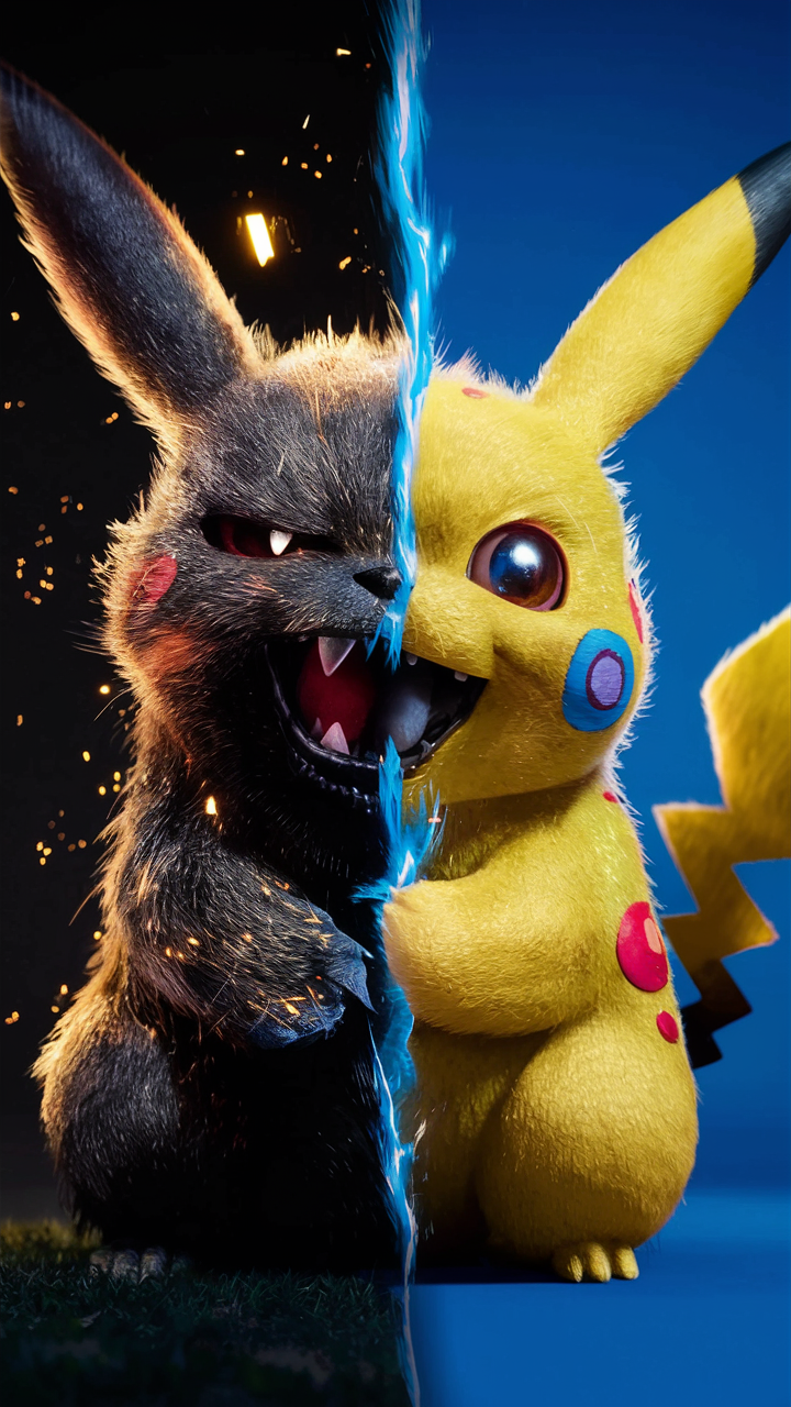 Discover this free Pikachu phone wallpaper that uniquely combines dark and bright aesthetics in one striking HD background. The left half displays an intense, dark Pikachu with red eyes and fiery sparks, creating a fierce, edgy vibe, while the right half features the cheerful classic yellow Pikachu with smooth fur and colorful spots. A dynamic blue energy line sharply divides the two sides, enhancing the contrast and visual appeal. This high-definition phone wallpaper perfectly suits both iPhone and Android devices, ideal for fans looking for a dark wallpaper mixed with vibrant colors. Upgrade your lockscreen with this visually powerful and free Pikachu wallpaper that blends intensity and friendliness in perfect harmony.