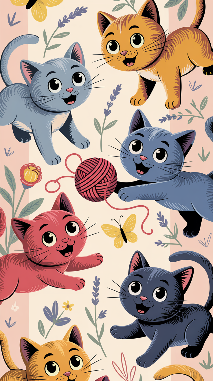 Discover this free playful colorful cartoon cats phone wallpaper perfect for adding a lively and cheerful touch to your device. This HD background features six vibrant cartoon cats in orange gray blue red and black colors with joyful faces and large expressive eyes. The whimsical scene includes flowers leaves butterflies and a ball of red yarn for a fun aesthetic ideal for anyone wanting a cute and joyful dark wallpaper alternative. Compatible with all major phone models including iPhone and Android devices this bright and colorful wallpaper is easy to download and makes your lockscreen stand out with high resolution and charming details.