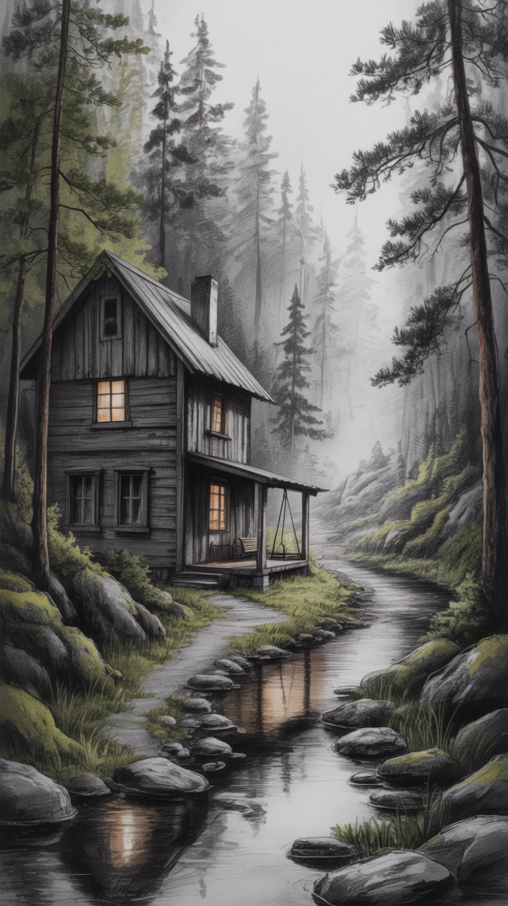 Enhance your device with this free serene misty forest phone wallpaper that captures a tranquil and cozy vibe. The image features a rustic wooden cabin nestled among tall pine trees with warm glowing windows, set beside a gently winding stream. The misty atmosphere adds a touch of mystery and calm, making this HD background an ideal dark wallpaper choice for nature lovers. Compatible with both iPhone and Android devices, this high-resolution wallpaper brings peaceful forest aesthetics right to your lock screen. Perfect for anyone seeking a natural, rustic feel on their phone display.