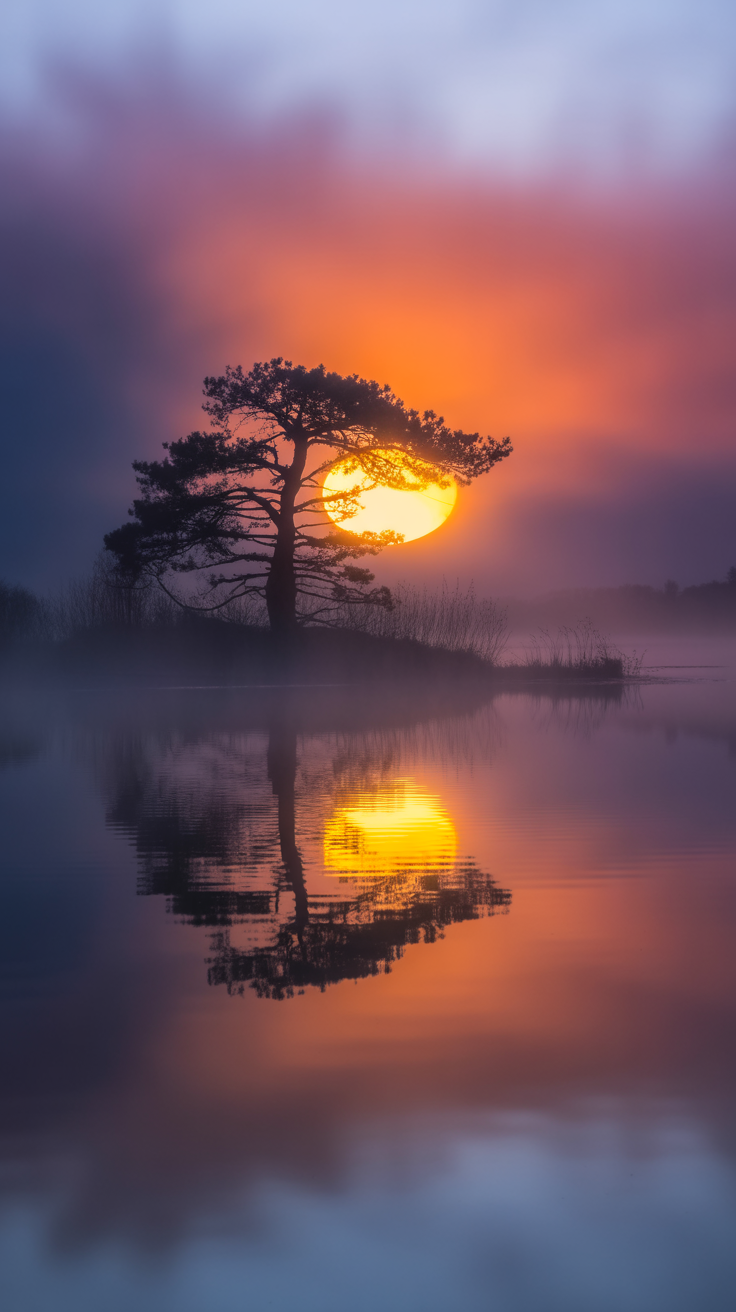 Elevate your phone’s aesthetics with this free serene sunset phone wallpaper that perfectly blends natural tranquility and vivid colors. This HD background features a large solitary tree silhouetted against a warm orange and yellow sun, set within a dreamy sky of purples, pinks, and oranges. The calm water below mirrors the stunning scene, creating a peaceful vibe ideal for anyone seeking a soothing lockscreen. Compatible with both iPhone and Android devices, this dark wallpaper adds a sophisticated touch to your phone while ensuring clarity and vibrance on all screen sizes. Download now to enjoy a beautifully crafted wallpaper that enhances your phone experience with natural beauty and calming tones.