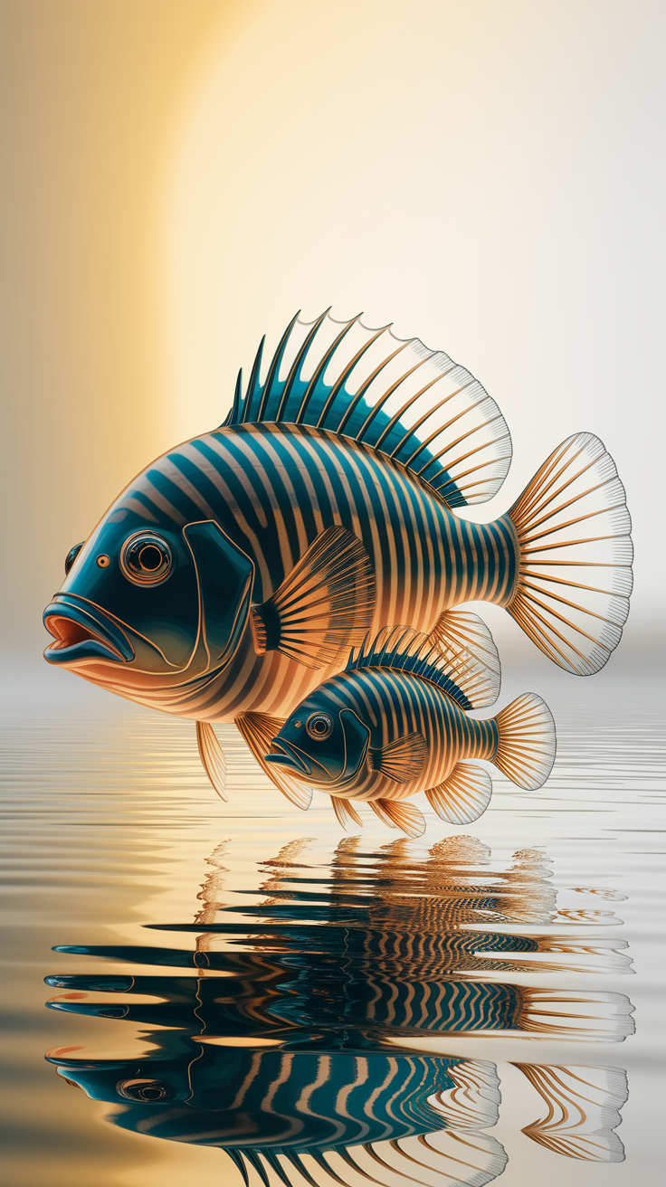 Enhance your device with this free stylish dark phone wallpaper featuring two artistic fish with dark blue and gold striped bodies. The design showcases a serene and elegant vibe, created with digital 3D-rendering style that stands out as an HD background. The reflective water surface adds depth, while the warm gradient from pale cream to golden-orange provides a soothing contrast to the dark wallpaper elements. Perfectly compatible with most smartphones including iPhone and Android devices, this wallpaper delivers a high-quality visual experience that complements dark mode themes and adds a sophisticated touch to your lockscreen or home screen.