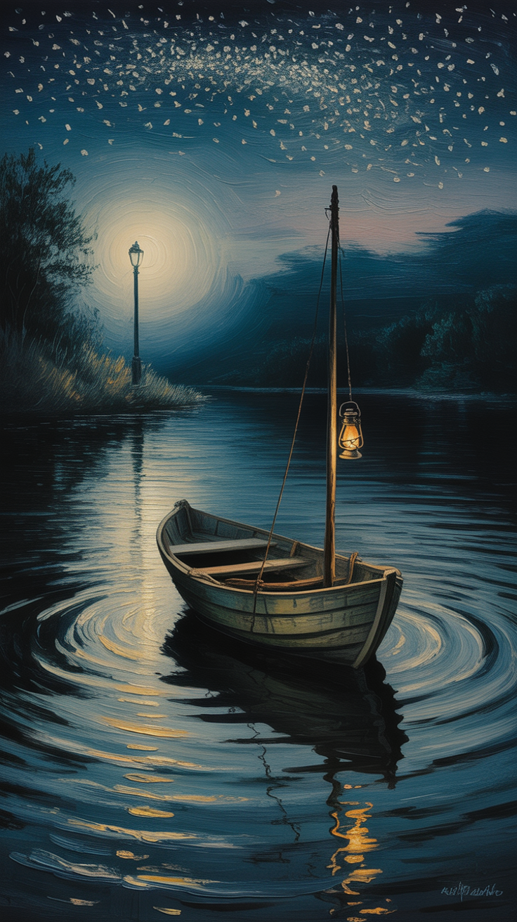 Discover this free tranquil nighttime phone wallpaper that brings calm and serenity to your device. This HD background showcases a small wooden boat floating peacefully on still water, lit by a warm lantern glow and a nearby streetlamp. The deep blues and soft yellows create a soothing dark wallpaper perfect for those who love peaceful night scenes. Ideal for both iPhone and Android devices, this free phone wallpaper offers a beautifully painted aesthetic with visible brushstrokes adding an artistic touch. Elevate your lockscreen with this serene and calm wallpaper that enhances your phone’s visual appeal while maintaining a relaxing vibe.
