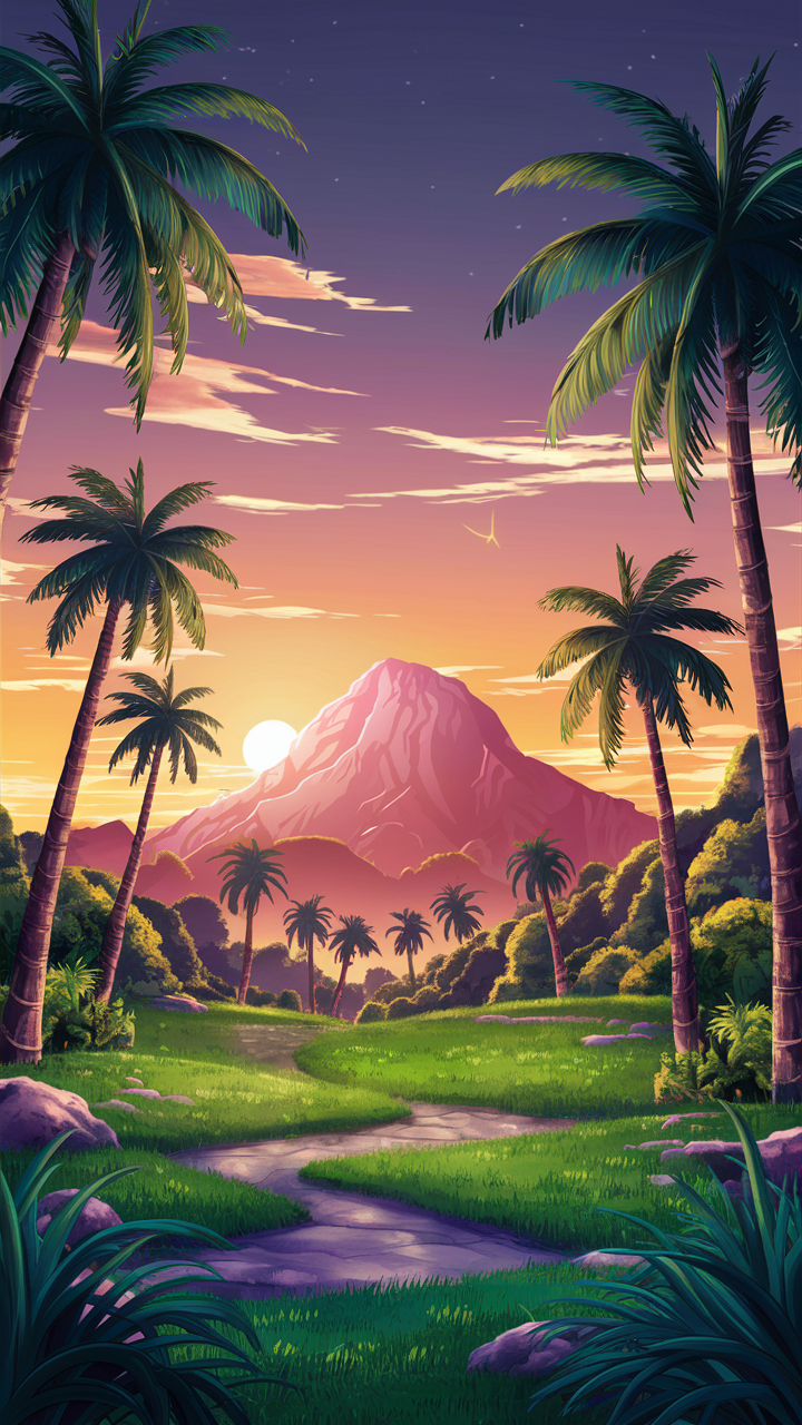 Enhance your phone with this stunning free tropical sunset wallpaper lockscreen. Featuring a winding path, lush tropical plants, and tall palm trees against a majestic pink mountain backdrop, this wallpaper captures the serene beauty of nature at sunset. Perfect for both iPhone and Android devices, this vibrant lockscreen transforms your phone with peaceful and inviting colors. Download this free tropical phone wallpaper lockscreen today and bring tranquil coastal vibes to your device.
