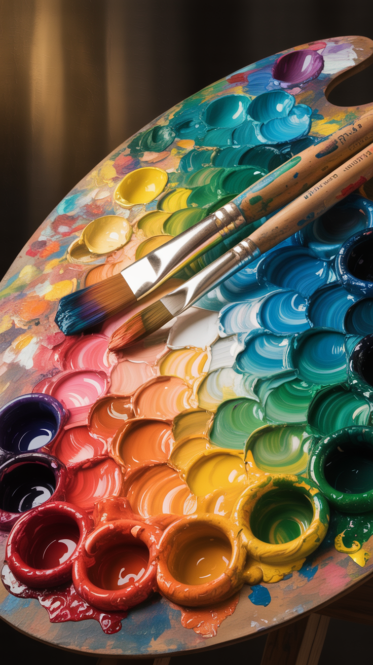 Discover this free vibrant colorful artistic phone wallpaper designed to inspire creativity and bring life to your device. Featuring a wooden artist’s palette with a full spectrum of bright oil paints and dual loaded paintbrushes, this HD background delivers rich colors and a warm, artistic vibe. Its soft blurred warm-toned background adds depth and focus, ideal for both iPhone and Android lock screens. Perfect as a dark wallpaper alternative or colorful phone background, this image blends artistic expression with device compatibility, elevating your phone’s aesthetic with visual creativity and flair.