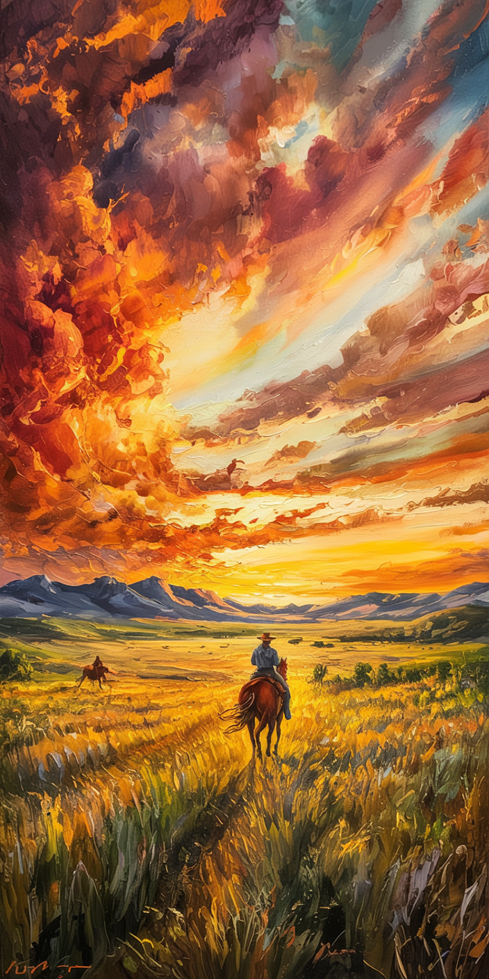 Experience the captivating beauty of this free vibrant cowboy landscape phone wallpaper. With rich warm colors and an explosive sunset sky in shades of orange, red, and yellow, this HD background brings a dramatic and adventurous vibe to your device. Perfect for iPhone and Android users, it features two cowboys on horseback riding through a field of tall grasses and wildflowers beneath purple-blue mountains. This dark wallpaper with contrasting bright skies enhances the depth and texture of your lockscreen while offering an immersive nature-inspired aesthetic. Compatible across various phone models, this free wallpaper adds a unique and vivid look to your device.