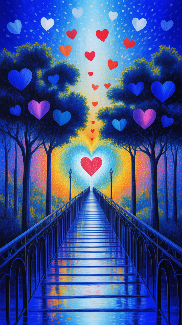 This free vibrant dreamy phone wallpaper captures a surreal nighttime scene with a long reflective bridge extending towards a glowing heart in the horizon. Set amidst tall forest trees painted in deep blues and purples, the HD background offers a serene and magical vibe ideal for users craving a peaceful and emotional aesthetic. The radiant twilight sky transitions beautifully from deep blue to warm yellow and orange hues, while floating colorful hearts add a touch of love and positive energy to your device’s lockscreen or home screen. Compatible with both iPhone and Android phones, this dark wallpaper brings an enchanting atmosphere that enhances any device with its high-quality resolution and unique artistic style.