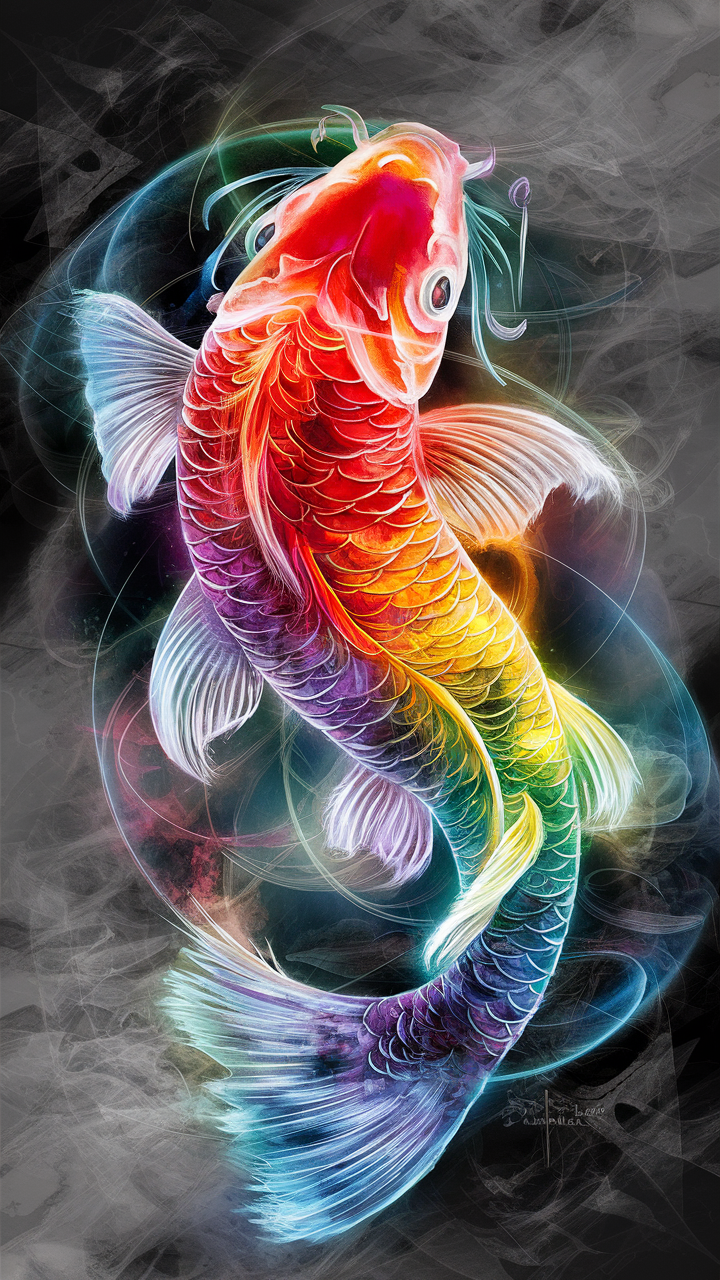 Discover this free vibrant koi fish phone wallpaper, perfect for adding a splash of color to your device. Featuring a beautifully detailed digital artwork of a koi fish, this HD background blends bright reds, oranges, yellows, greens, blues, and purples with a dark smoky backdrop. The dynamic and surreal aesthetic creates a captivating and ethereal vibe, ideal for phone users looking for an artistic and eye-catching lockscreen. Compatible with most iPhone and Android devices, this dark wallpaper enhances the look of any phone with its vivid colors and smooth gradients, making your lockscreen stand out in style.