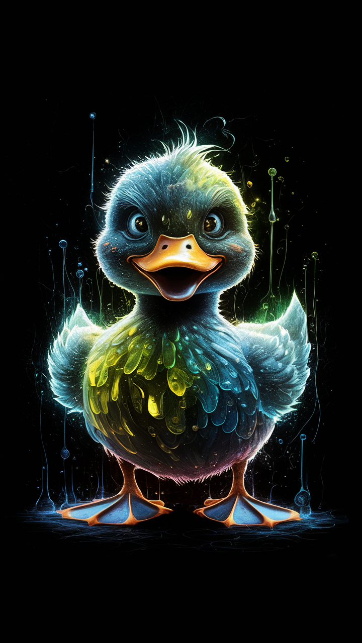 Discover an enchanting phone wallpaper featuring a vibrant, glowing duckling rendered in stunning HD quality. This free wallpaper blends realism and fantasy with its luminous blue, green, and yellow feathers highlighted by ethereal droplets and streaks of light on a deep black background. Perfect as a dark wallpaper, it brings a playful and magical vibe to your device. Compatible with both iPhone and Android phones, this HD background brightens your lockscreen and home screen while maintaining a sleek, modern look. Enhance your phone with this unique, high-quality wallpaper that stands out for its cheerful expression and mesmerizing glow.