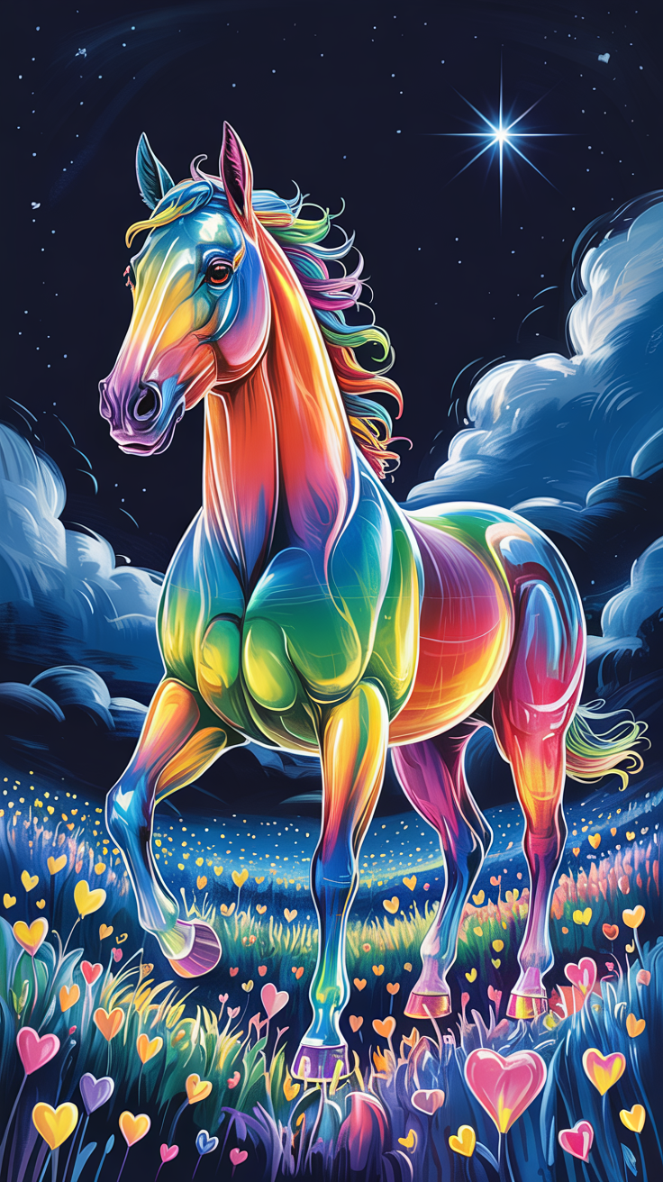 Experience the magic of this free vibrant rainbow horse phone wallpaper designed to transform your device with a stunning HD background. This colorful digital painting showcases a surreal horse in bright, smoothly blended rainbow hues standing in a field of heart-shaped flowers. Set against a dark wallpaper of a starry night sky, the dreamy clouds add a whimsical feel that elevates the overall aesthetic. Perfectly compatible with both iPhone and Android devices, this wallpaper gives your phone a fresh, eye-catching look while maintaining crisp high-definition quality. Add this fantastical wallpaper to your collection to enjoy a unique and vivid display every time you unlock your phone.