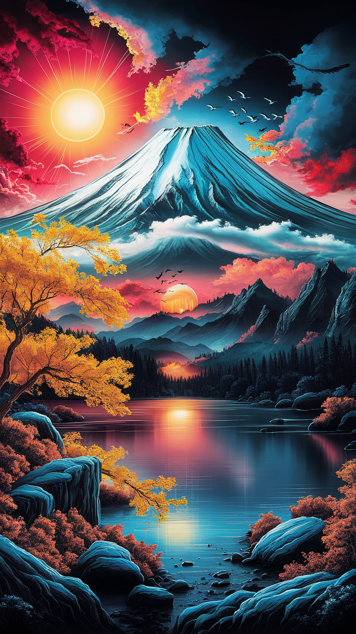 Discover this free vibrant surreal mountain phone wallpaper that combines dramatic natural elements with a fantastical vibe. Featuring a snow-capped peak reminiscent of Mount Fuji, this HD background highlights a fiery sun casting radiant beams across a gradient sky of reds, oranges, and blues. Bright yellow autumn trees contrast beautifully with cool blue-toned rocks and a serene reflective lake in the foreground. Dynamic birds flying add life and motion to this dark wallpaper perfect for those seeking both vivid colors and calming nature scenery. Compatible with all devices including iPhone and Android phones, this free wallpaper delivers a high-quality, eye-catching backdrop for your lockscreen or home screen.