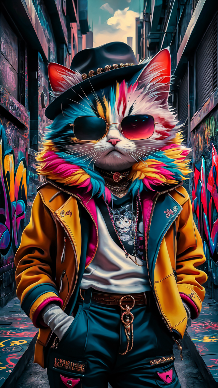 Discover this free vibrant urban cat phone wallpaper that brings a lively and artistic touch to your device. Featuring a multicolored neon-furred cat dressed in stylish streetwear with oversized sunglasses and layered accessories, this HD background captures the essence of street art and urban fashion. The graffiti-filled alley adds an edgy aesthetic, making it a perfect dark wallpaper alternative with bright accents. Designed for both iPhone and Android phones, this colorful wallpaper enhances any lockscreen with a playful yet confident vibe. Download this high-quality phone wallpaper now to give your device a unique, trendy look that reflects boldness and creativity.